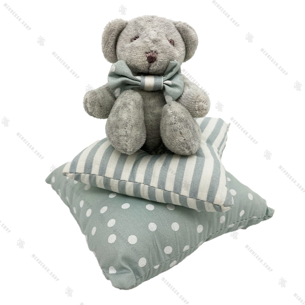 | سایر مشخصات | دارای دو بالشت زیر عروسک, دارای پاپیون طوسی راه راه |