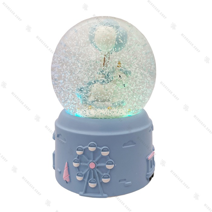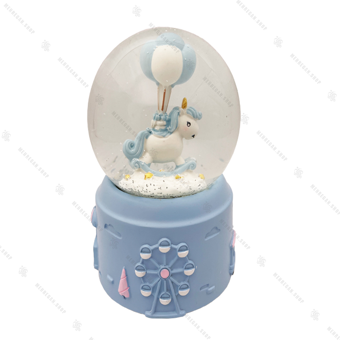 سایر مشخصات | مجسمه اسب سفید با یال آبی, دارای پایه آبی رنگ به طرح چرخ و فلک برجسته, باطری خور, دارای پمپ گردش برف اتومات داخل گوی |
